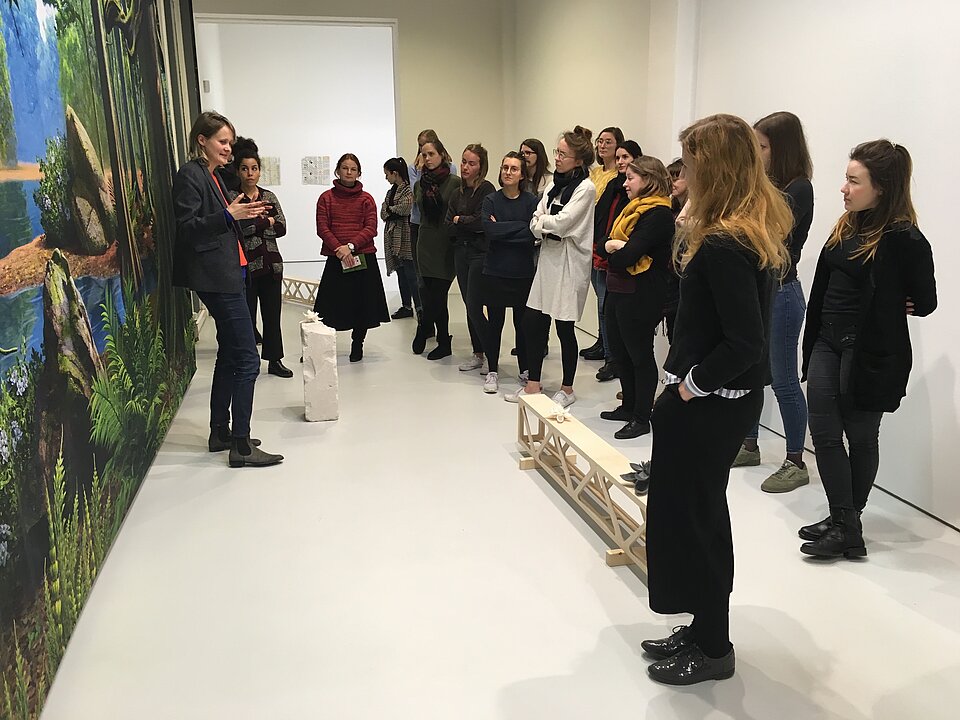 Im Studiengang Kunstvermittlung und Kulturmanagement liegt ein besonderer Schwerpunkt auf Exkursionen, der Vernetzung mit Akteuren des Kunstmarkts im näheren Umfeld sowie einem generellen Praxisbezug. Kommen beispielsweise in der Vorlesung "Kuratorinnen und Kuratoren an Rhein und Ruhr" besagte KuratorInnen und DirektorInnen zu Gastvorträgen in die Universität, besuchen die teilnehmenden Studierenden der Übung "Art Talks // Art Walks" die meisten Akteure an deren jeweiligen Standorten. Die vorletzte Veranstaltung des Semesters fand am 16.01.2019 im KAI10 statt. Julia Höner, künstlerische Direktorin des KAI10, führte die Studierenden durch die Ausstellung der ars viva-PreisträgerInnen "Niko Abramidis & NE, Cana Bilir-Meier und Keto Logua". Neben dem Praxisbezug wird in dieser Veranstaltungsreihe vor allem das Netzwerk mit lokalen Institutionen enger verknüpft, Fragen können gestellt, weiterführende Praktika können vermittelt werden.