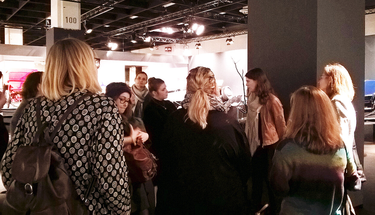 Auch gegenüber kritischen Fragen blieben die Spezialisten offen. Christian Nagel von der Kölner Galerie Nagel Draxler verwickelte die Gruppe beispielsweise in eine angeregte Diskussion über die Entwicklung des Kunstmarktes. In der Ausstellungskoje zeigte die Galerie Linolschnitte von Thomas Klipper. Der Künstler macht sich für seine politischen Arbeiten eine traditionelle Drucktechnik zu nutze. Das Besondere: als Druckstock verwendet er unter anderem die Parkett- oder Linolböden historisch bedeutsamer Gebäude, wie etwa den Kantinenboden der MfS-Zentrale in Berlin. Über die angewandte Technik und Klippers kritischen Umgang mit der deutsch-deutschen Geschichte, warf das Gespräch rasch das Thema auf, welche Arbeiten aus Käufersicht attraktiv und spannungsreich seien.
