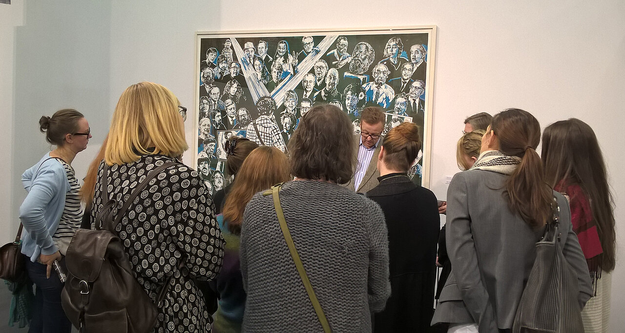 Hauptanliegen des ART WALK sind allerdings die Gespräche mit den Experten und Expertinnen aus Kunsthandel und öffentlichen bzw. privaten Ausstellungshäusern. Die Gruppe besuchte hierzu vor allem regional ansässige Galerien: Werner Klein von der Galerie Klein aus Köln stellte sich ebenso den Diskussionen wie Dr. Rupert Pfab aus Düsseldorf oder die Generaldirektorin der Setareh Gallery Emma Nilsson. Im Austausch mit den Studierenden zeigten sich die Galeristen und Kunsthändler aufgeschlossen und interessiert- die Gespräche kreisten dabei um Themen des Messealltags, um Verkaufsgespräche oder aktuell zu beobachtende Trends im Kunsthandel. Dass man dabei schnell schon einmal abschweift machte die Gesprächsrunden nur interessanter. Von generellen Themen, wie etwa der Kontakt zu Kunden auf der Messe hergestellt wird, bis zu sehr konkreten Fragen zu Arbeiten der ausgestellten Künstler, bot alles genügend Gesprächsstoff.