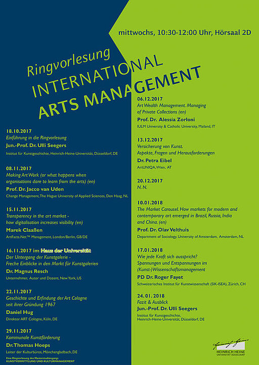 Seit dem Wintersemester 2016/2017 wird an der HHU der interfakultäre Masterstudiengang "Kunstvermittlung und Kulturmanagement" angeboten, der durch eine langjährige erfolgreiche Zusammenarbeit des Instituts für Kunstgeschichte und den Wirtschaftswissenschaften entstanden ist. Wie der Studiengang vermittelt und reflektiert auch die Vorlesung die produktiven und vielfältigen Austauschbeziehungen zwischen Kultur und Ökonomie. Nachdem im WiSe 2015/16 der Schwerpunkt auf der Kunstvermittlung lag, gerät nun das Kunstmanagement stärker in den Fokus. Internationale Referent*innen aus unterschiedlichen Bereichen in Kunst, Kultur und Wissenschaft (Museum, Galerie, Messe, Kulturbehörde und Wissenschaft u.a.) beleuchten das breite Feld des Kulturmanagements aus interdisziplinärer Perspektive in Theorie und Praxis. Ziel ist es, eine Vielzahl an Gegenständen, Theorien, Methoden und Modellen des zeitgenössischen Managements im Kunst- und Kulturbereich aus internationaler Perspektive und an konkreten Anwendungsbeispielen (best practice) kennenzulernen und vergleichen zu können. Durch die enge Verzahnung von Kunstgeschichte und Betriebswirtschaftslehre dient die Veranstaltung auch dem besseren Verständnis von fachlich interdisziplinären Zusammenhängen.