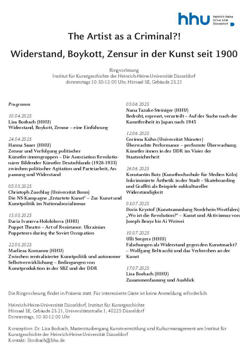 Ab 10.04.2025 findet donnerstags die Ringvorlesung unter dem Thema "The Artist as a Criminal?!