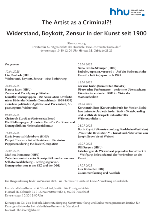 Künstlerischer Widerstand, Boykott und Zensur sind eng mit politischen und gesellschaftlichen Systemen verknüpft – sei es in autoritären Regimen oder Demokratien. Kunst kann Protest sichtbar machen, Deutungshoheit infrage stellen und neue Kunstbegriffe provozieren. Die Ringvorlesung beleuchtet diese Dynamiken vom 20. Jahrhundert bis in die Gegenwart und fragt, wie weit künstlerische Freiheit gehen darf.