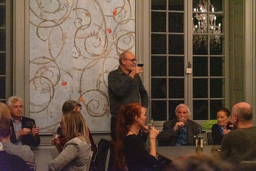 Am 12.12.2019 trafen sich über 90 Mitarbeitende und Freunde des Instituts für Kunstgeschichte in Schloss Benrath zur obligatorischen Weihnachtsfeier, die in diesem Jahr auch eine Überraschungsparty für Prof. Dr. Jürgen Wiener anlässlich seines 60. Geburtstags darstellte. In mehreren Reden seitens des Dekanats, der Institutsleitung und vielen Kolleg*innen wurden Jürgen Wieners Forscherpersönlichkeit sowie sein Engagement in der Lehre wie auch als allseits beliebter Freund und Kollege gewürdigt. Die Feier gipfelte in der Übergabe der Festschrift „Absolutely free? Invention und Gelegenheit in der Kunst“, die einige seiner Kolleg*innen und Schüler*innen vorbereitet hatten.