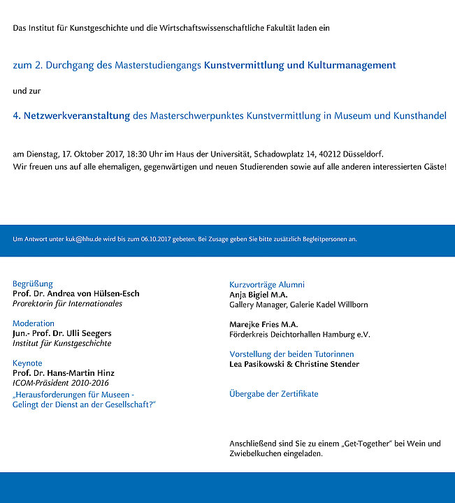 Um Rückmeldung unter kuk@hhu.de wird bis zum 06.10.2017 gebeten. Bei Zusage geben Sie bitte zusätzlich Begleitpersonen an.